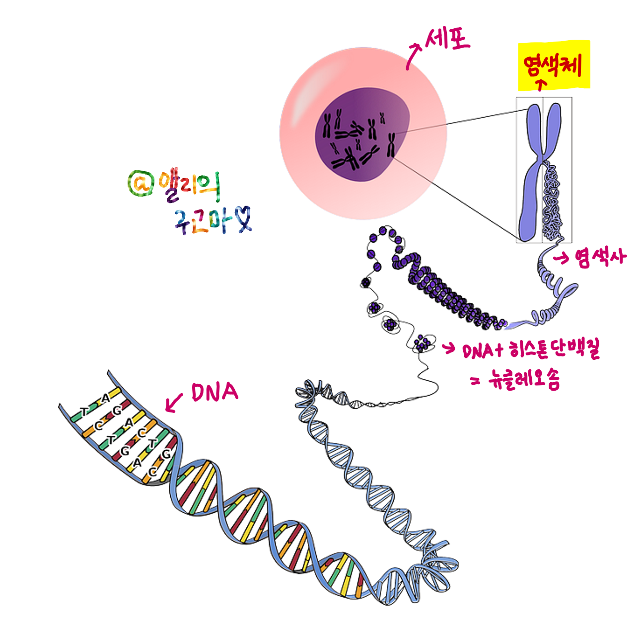 그림에서 세포 안에 보면 염색체가 여러개 있어요.