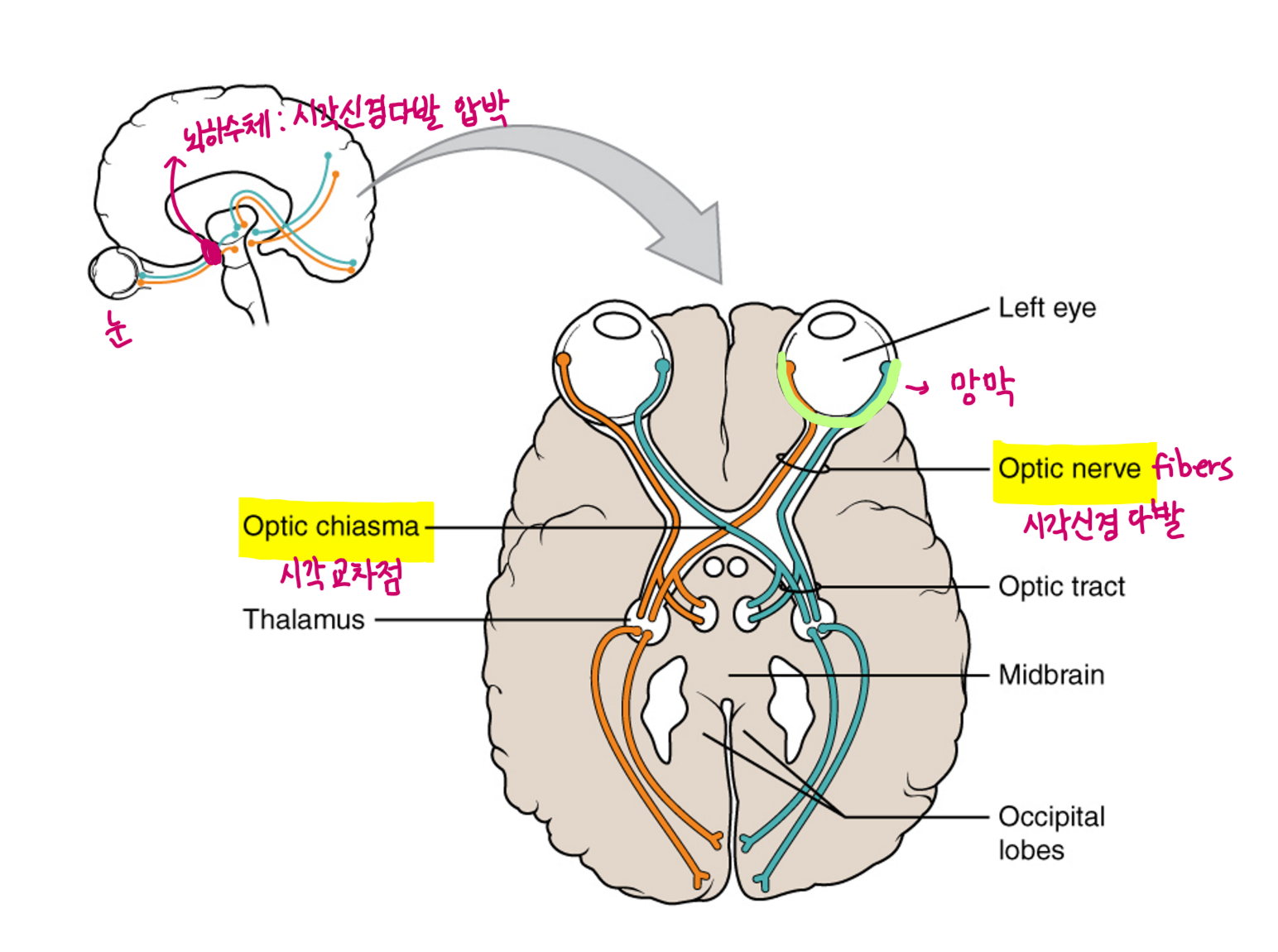 눈쪽 망막으로 부터 나오는 시각신경 다발은 시각교차점에서 교차되어 뇌하수체에 닿습니다.